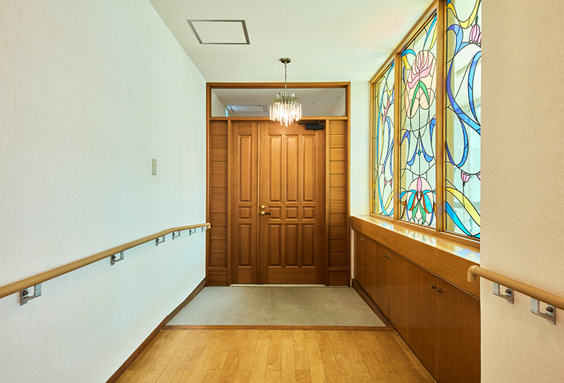 廊下には美しいステンドグラスがあり、日差しを浴びて心地よい空間を演出しています。手すりも設置され、安全にお過ごしいただけます。